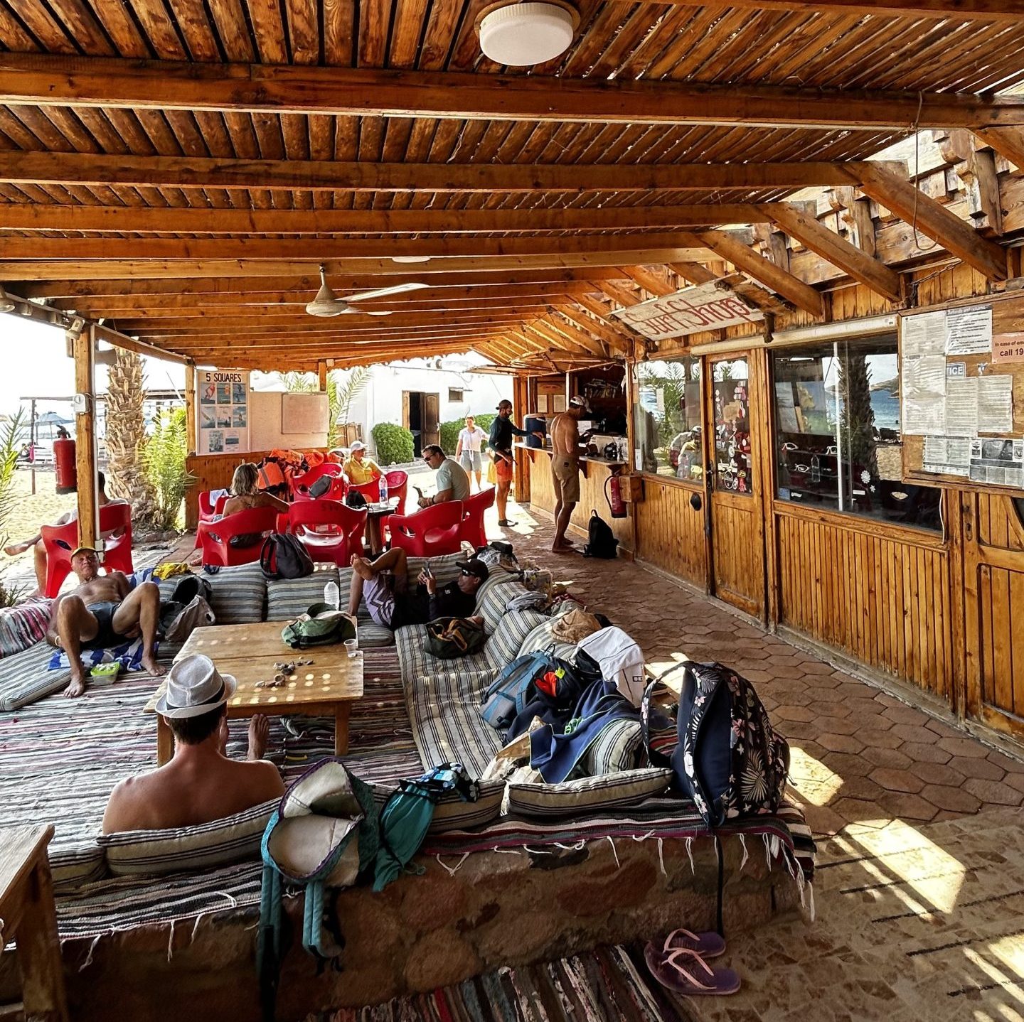 The Chill-out Zone: Our spacious shaded terrace is a legendary meeting point. Furnished with traditional rugs and comfortable lounge areas, it is the perfect place to study the wind map or decompress after a high-intensity session.